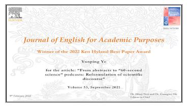 北理工叶云屏教授获学术英语顶级期刊JEAP“最佳论文奖”