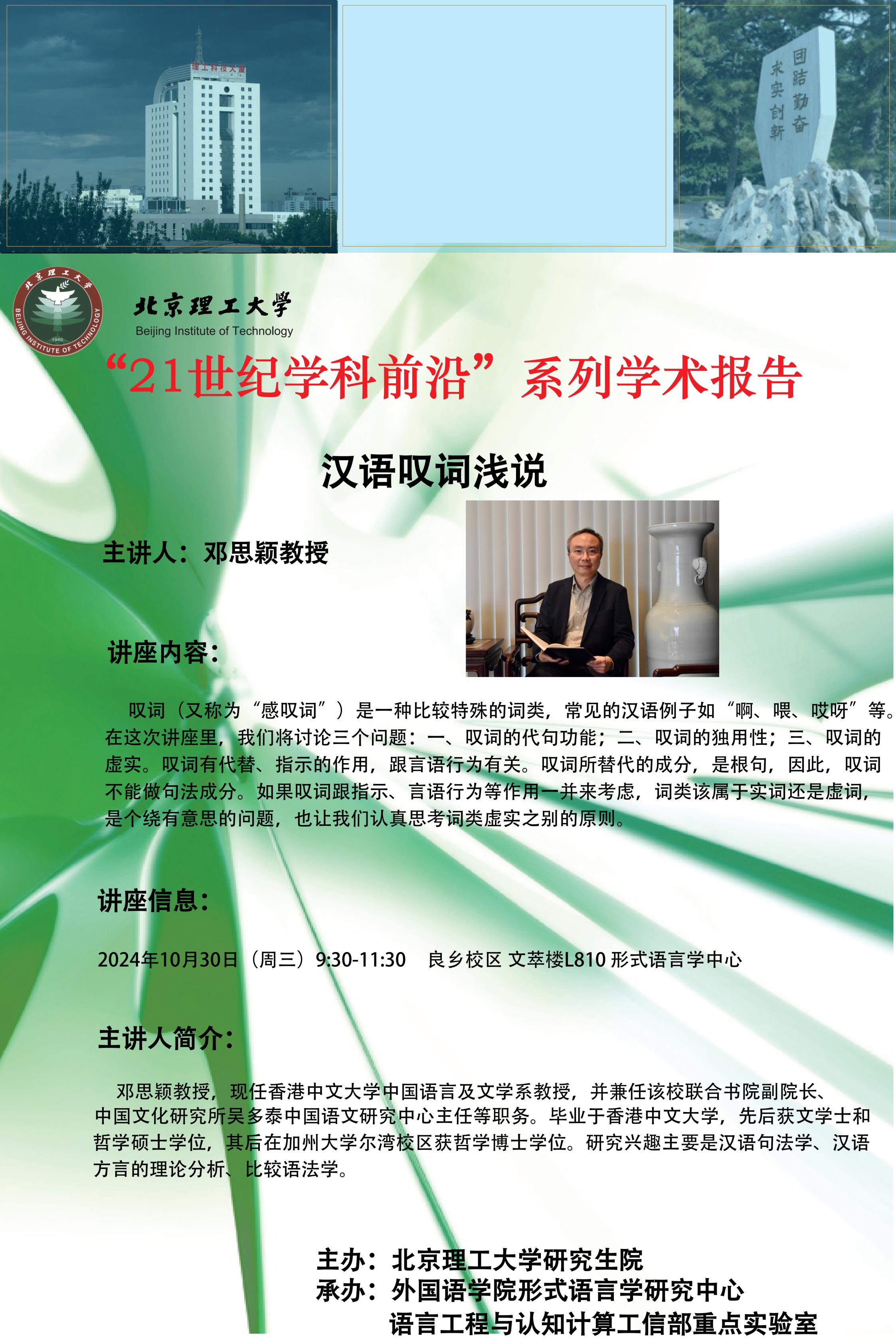 供稿:李溪童 供图:汪昌松 编辑:陈文婧 2024年10月30日上午,应外国语学院形式语言学研究中心邀请,香港中文大学中国语言及文学系邓思颖教授在北京理工大学良乡校区文萃楼形式语言学中心为我院师生作了题为“汉语叹词浅说”的学术讲座。讲座由外国语学院汪昌松副教授主持,李京廉教授、郭戈老师、纪悦老师、单俪娉博士、王子琪博士以及学院研究生参加了本次讲座。 在此次讲座中,邓思颖教授主要探讨三个问题:一、叹词的代句功能;二、叹词的独用性;三、叹词的虚实。邓教授指出,叹词有代替、指示的作用,...
