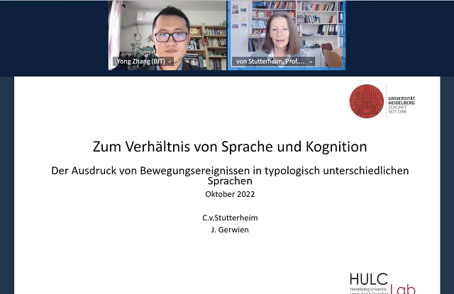 供稿、供图:李源科 编辑:王喆 2022年10月28日下午,德国海德堡大学现代语言学系副主任 Christiane von Stutterheim 教授应北京理工大学德语系邀请,为我校德语系语言学专业方向的师生作了题为“论语言与认知的关系——运动事件在不同类型语言中的表达方式”的线上学术讲座。该讲座为德语系主办的“德语语言学前沿研究系列讲座”的第一讲,由德语系副主任张勇副教授主持。 讲座伊始,针对语言和认知的关系,von Stutterheim 教授介绍了从莱布尼茨、洪堡特到平克的...